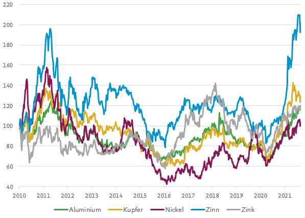 Die Preise vieler Rohstoffe kennen seit über einem Jahr nur eine Richtung: nach oben. Viele Basismetalle sind inzwischen so teuer wie seit beinahe zehn Jahren nicht mehr. Zinn erreichte gar ein nie gesehenes Rekordhoch. Seit Juli 2021 hat eine leichte Korrektur aller Basismetallpreise eingesetzt.