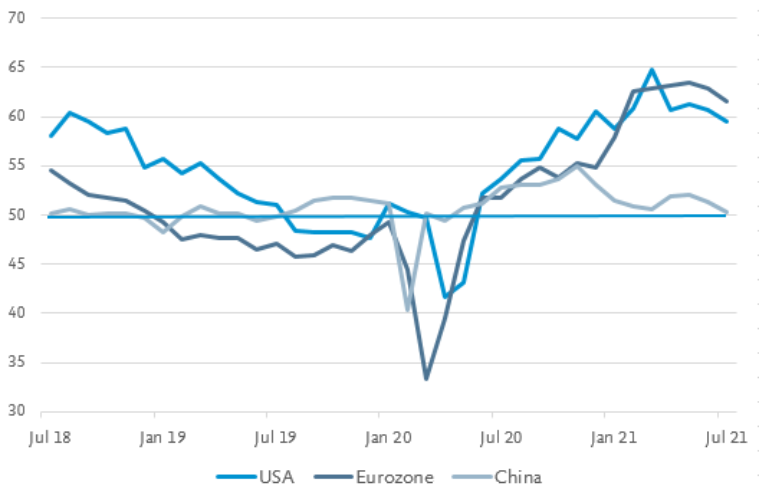 Die laufende Konjunkturerholung widerspiegelt sich in der steigenden Nachfrage nach Rohstoffen und der Ausblick bleibt positiv. Dies zeigen die Umfragen bei den Einkaufsmanagern, die sogenannten PMI (Purchasing Manager's Index). Nach dem starken Einbruch im Frühjahr 2020 zeigen die PMI-Indikatoren einen erfreulichen Aufwärtstrend. Unternehmen aus der Industrie blicken optimistisch auf die wirtschaftliche Entwicklung. Das belegen die PMI-Werte aus Europa und den USA, welche mit rund 60 Punkten deutlich im Expansionsbereich liegen. Diese Beweise einer expandierenden Wirtschaft sind ein positives Signal für die Nachfrage nach Industriemetallen.