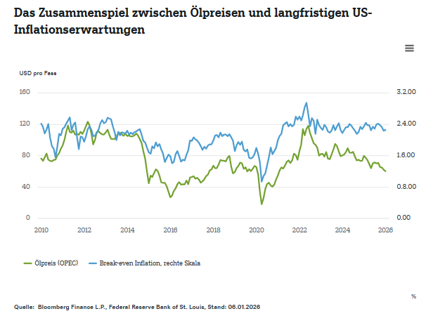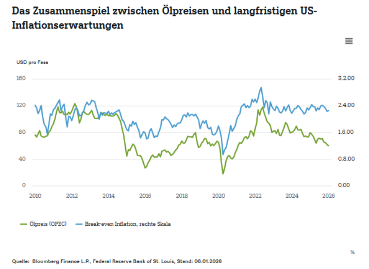 So kann schon die Aussicht auf mehr venezolanisches Öl die Preise drücken – und damit die Inflationserwartungen. Aber wie der Chart auch zeigt, war die Kopplung schon in der Vergangenheit nicht immer stabil. Nicht zuletzt wesentlich dafür ist, ob die Märkte den Notenbanken zutrauen, die Inflation im Griff zu behalten. Gelingt das, können Zentralbanken Ölpreisschocks aussitzen – solange sie nicht zu heftig ausfallen. Deshalb schauen sie gerne auf die Kerninflation, die Energie und Lebensmittel ausklammert.