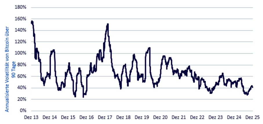 In der Phase der börsengehandelten Produkte (ETPs) auf Bitcoin in den Jahren 2024 bis 2025 ging es um den Zugang. 2026 wird es um die Portfoliofunktion gehen. Physisch unterlegte Bitcoin-ETPs haben Bitcoin fest in der institutionellen Marktinfrastruktur verankert. Gleichzeitig bleiben die makroökonomischen Bedingungen strukturell günstig. Die zunehmende Dominanz der Fiskalpolitik, die anhaltend hohe Staatsverschuldung und die fortschreitende geopolitische Fragmentierung verstärken die Nachfrage nach nichtstaatlichen monetären Vermögenswerten. Vor allem aber verändert sich das Volatilitätsprofil von Bitcoin. Die realisierte Volatilität ist zwar im Vergleich zu traditionellen Anlageklassen noch immer hoch, hat sich jedoch gegenüber früheren Zyklen deutlich verringert. Das ist eine notwendige Voraussetzung dafür, dass Bitcoin als strategische Allokation und nicht als kurzfristiges Handelsinstrument fungieren kann.