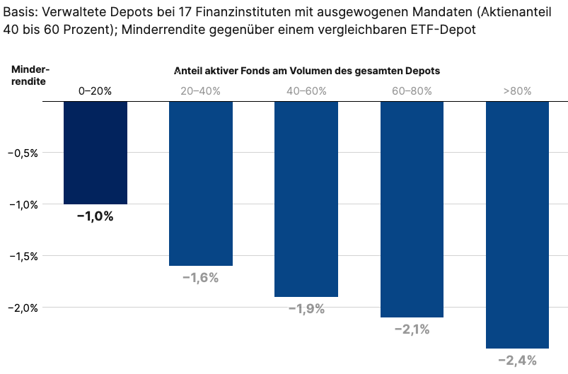 - Mit 2,4 Prozent fiel die Minderrendite bei Depots mit über 80 Prozent aktiven Fonds noch viel höher aus.